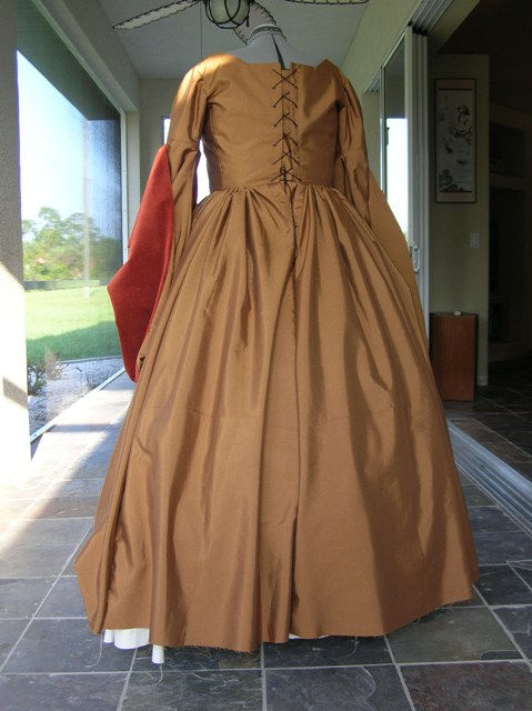 I made this gown for a lady who is herself a seamstress, and so she wanted to do all the trim and hemming. (Twist my arm... ;-) So the dress is incomplete in these photos. It also doesn't have the correct underpinnings, but as soon as I get photos of its owner wearing it, I will post them here. You can also read my Tudor Gown Dress Diary if you are interested in hearing about construction details ad infinitum.